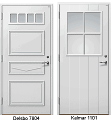 Vores yderdøre leveres monteret i vægblokkene. Ved bredere døre eller dobbeltdøre leveres disse løse med færdige dørhuller. Dørgreb og låsecylinder medfølger ved levering af garage eller carport. For huse er låsecylindre ikke inkluderet, da du normalt vælger din egen låseserie. Vi leverer kun døre af højeste kvalitet, og som standard er de altid lakeret for at have den længst mulige levetid. Vi har valgt Diplomat Dörrar som hovedleverandør på grund af den høje kvalitet, de er kendt for. Vi har adgang til hele Diplomat Dörrars sortiment, så har du ønsker til andre farver, dekorer eller en dør med glasparti, skal du bare spørge os; så laver vi en pris.
