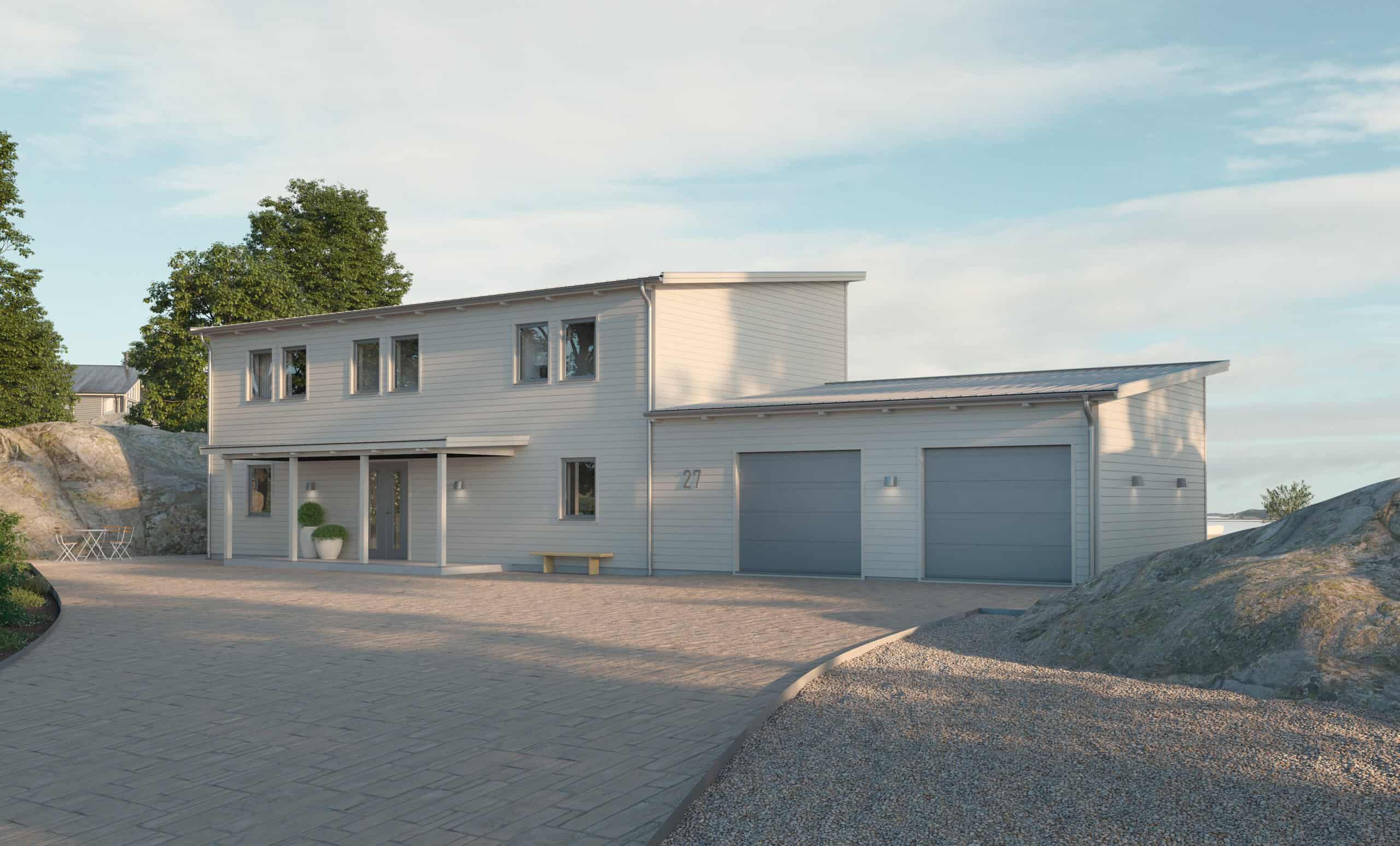 Velkommen til et herskabeligt hjem i form af en 2-etagers villa kombineret med en dobbeltgarage. Dette hus passer ind i de fleste miljøer og har en rummelig planløsning. Den store dobbeltgarage, som tilgås fra vaskerummet uden at man behøver at træde ud af huset, er intet mindre end luksus hver dag!
