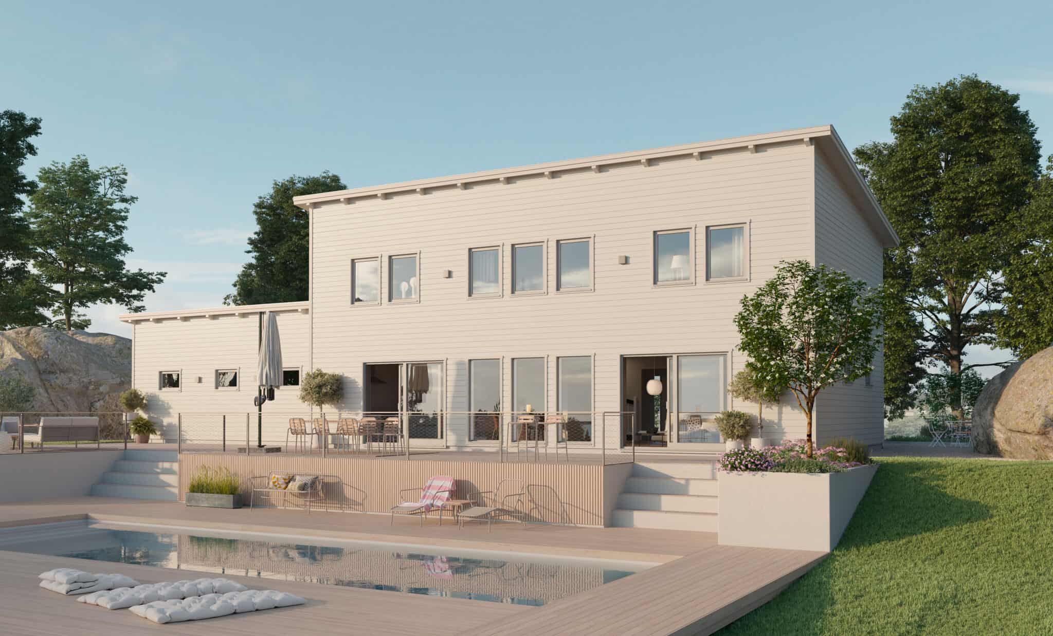 Huset har en moderne stil med et lavt gavltag dækket af tagplader. Indgangssiden med to motoriserede garageporte og et stort verandatag giver et imødekommende og herskabeligt indtryk. Bag huset er terrassen, som i dette eksempel er blevet til et poolområde. De store vinduespartier lukker masser af lys ind og giver en smuk udsigt. På sommerdage åbner begge skydedøre op for at skabe nem adgang til husets køkken, og Foch lader huset fortsætte ud i haven.