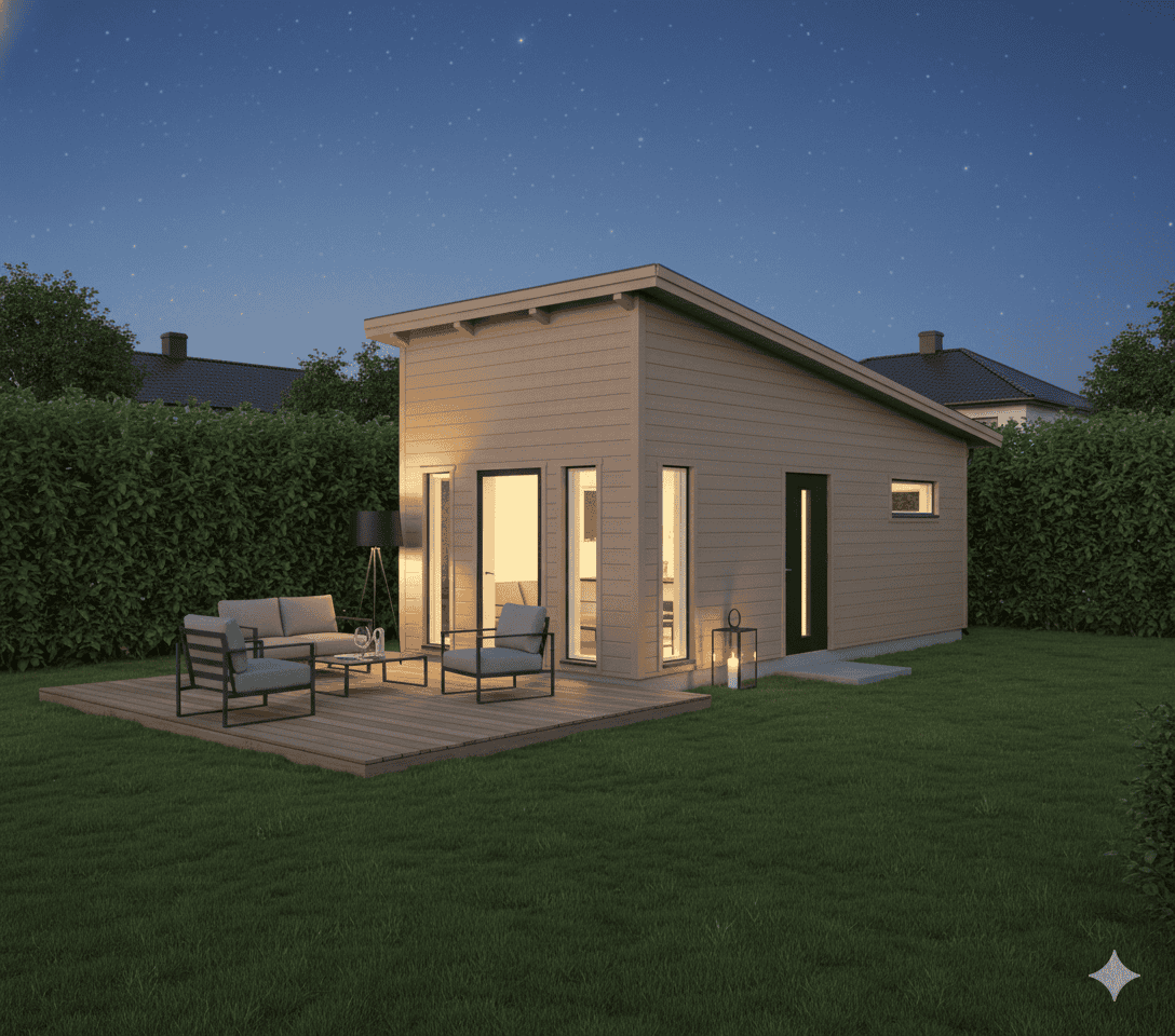 Attefallshus med 2 sovrum. Det stora skjutpartiet ger en underbar utsikt och ljusinsläpp och ökar rymden i detta hus. Perfekt för gästhus eller Airbnb boende.