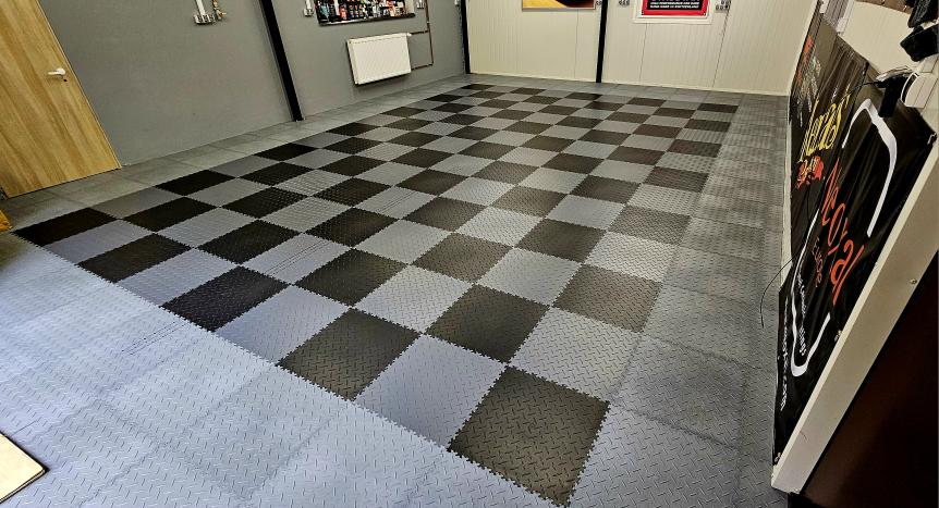 Om du vill ha en snabb och enkel förändring är golvplattor i plast/gummi det perfekta valet. Dessa plattor klickas enkelt ihop direkt på betongplattan utan lim eller specialverktyg. De finns i flera färger, vilket gör att du kan skapa egna mönster, som till exempel en klassisk racing-rutig look. Du kan till och med beställa plattor med egen print så du kan ha En stor logga från ditt favoritmärke i garaget.