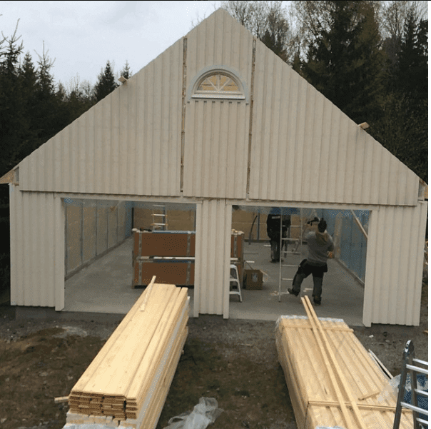 De bredare byggnaderna levereras med delad gavelspets för att du skall kunna hantera den för hand. Det gör att du slipper hyra in en kranbil för att lyfta gavelspetsen på plats. Bildexemplet på garaget nedan har gavelspets i 3 delar. Täckbräda/lock sätts över skarven som helt försvinner.