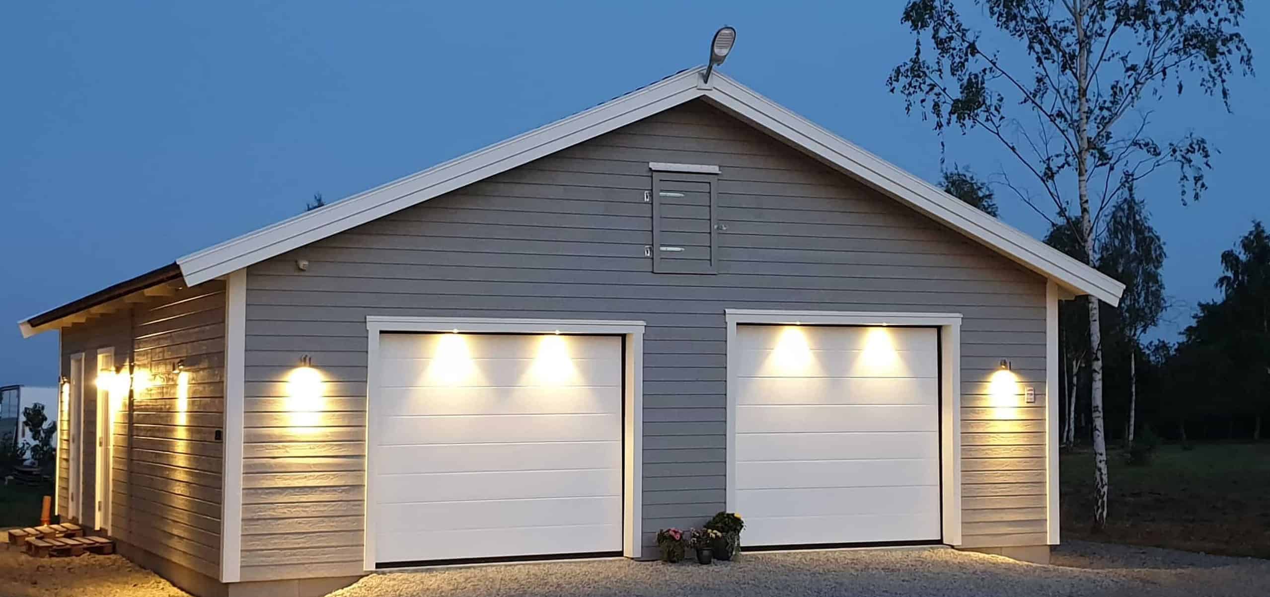 Våra dubbelgarage byggs av väggblock med dörrar och fönster monterade. Det gör att vi har en mycket kort monteringstid och därmed sparar du tid om du vill bygga själv eller pengar om du vill ha det monterat och klart. Dubbelgarage finns i många utföranden. Med förråd, med gäststuga, verkstadsdel, slaktbod mm. Vi har byggt dubbelgarage med exempelvis gym, lägenhet och till och med yta för Sveriges största Star Wars-samling. Möjligheterna är oändliga och din fantasi är det enda som sätter gränser. En rolig vattendelare är om man vill ha en bred garageport eller två mindre. Vilket du än väljer så kan vi hjälpa dig med ditt dubbelgarage.