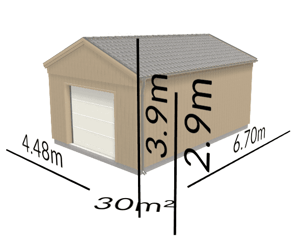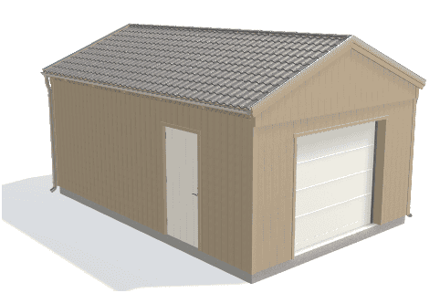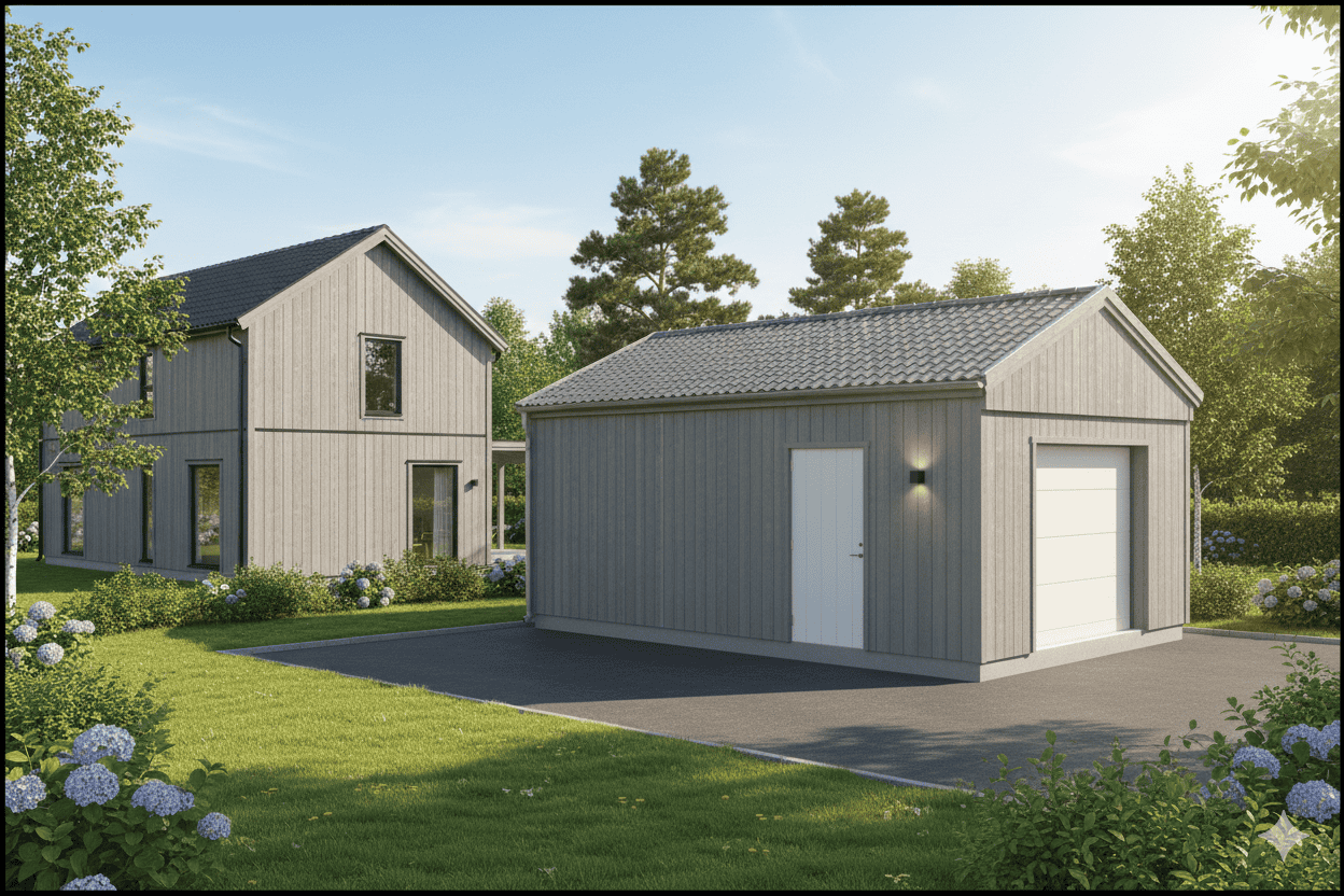 Ett Attefallsgarage I modern ladhusstil med kort takfot. Med stående spårpanel och benders takpannor är detta ett vackert garage som passar till många olika hustyper. Garaget levereras omålat för att du ska kunna välja att lasera, behandla med tjärvitriol eller måla i valfri färg.