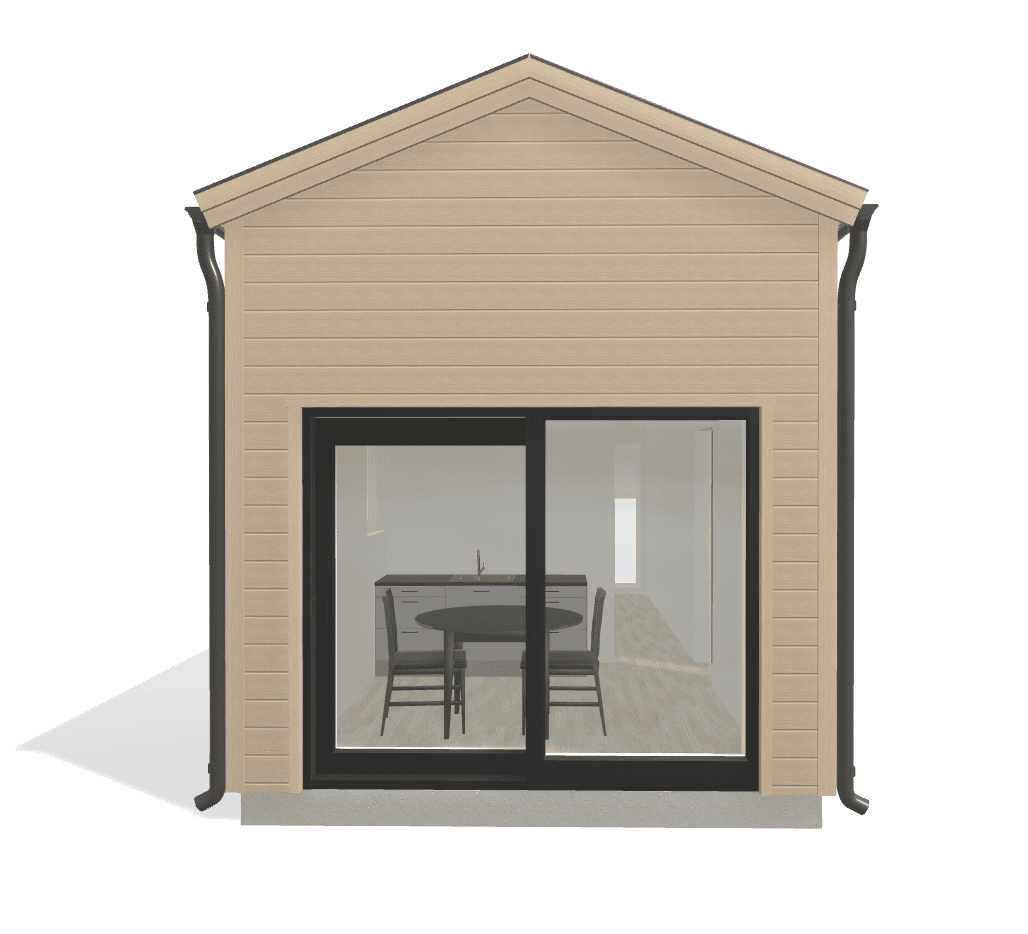 Med 3 m väggar och ett låglutande sadeltak får du en höjd på byggnaden som ändå klarar maxhöjd 4 m som gäller för attefallshus 30 kvm. Taket är klätt med plåttak plannja trend som förstärker den moderna arkitekturen. Med ett skutdörrsparti i glas upplevs allrummet med litet kök en känsla av rymd. Väljer du istället att sätta ett vikparti i den förberedda öppningen kan du öppna upp hela gaveln och helt sudda ut gränsen mellan inne och ute. Mitt i huset finner du en toalett som skiljer kök från sovrum. Detta är en planlösning som överaskar och imponerar i sin enkelhet och praktiska funktion.