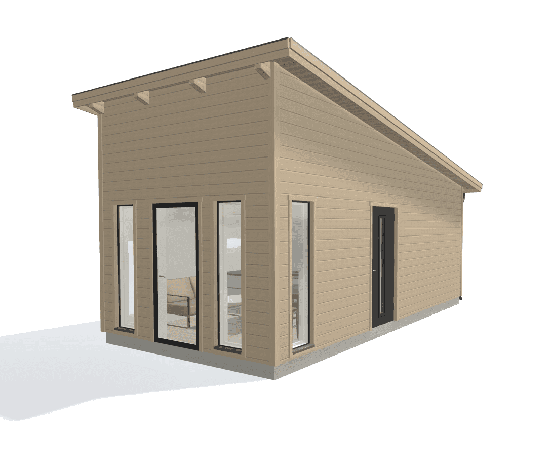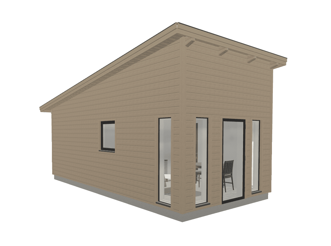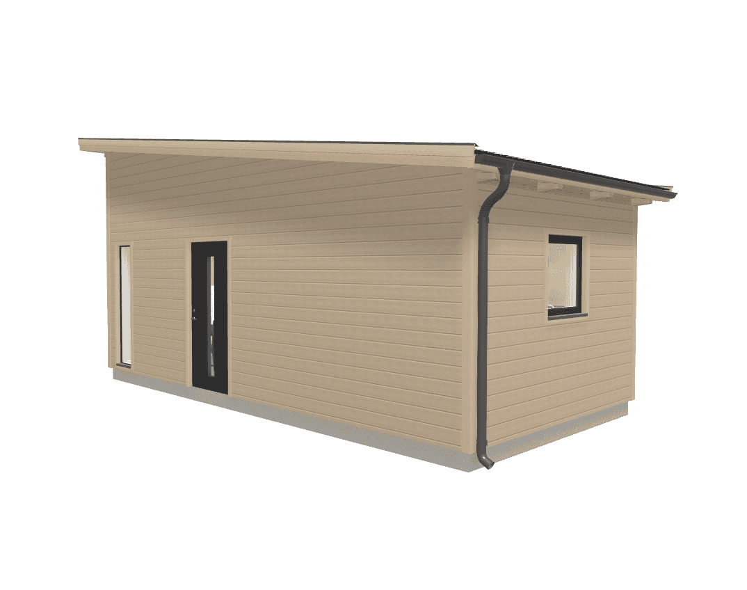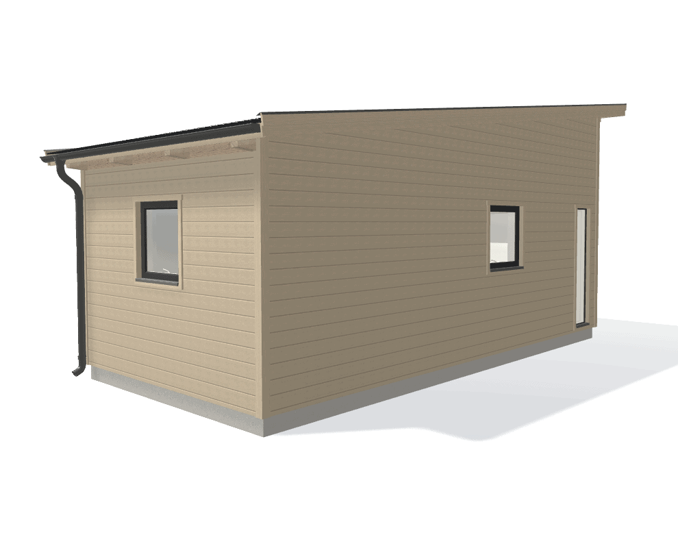 Attefallshus med pulpettak 8° lutning och liggande spårpanel. Denna byggnad ger ett modernt intryck med sina höga fönster och praktisk planlösning. Med denna byggsats får du plats med sovrum och en toalett med dusch. Dessutom ett kök med utsikt och stora ljusinsläpp. Det ger ett kompakt men funktionellt boende samtidigt som det klarar reglerna för attefallshus 30 kvm.