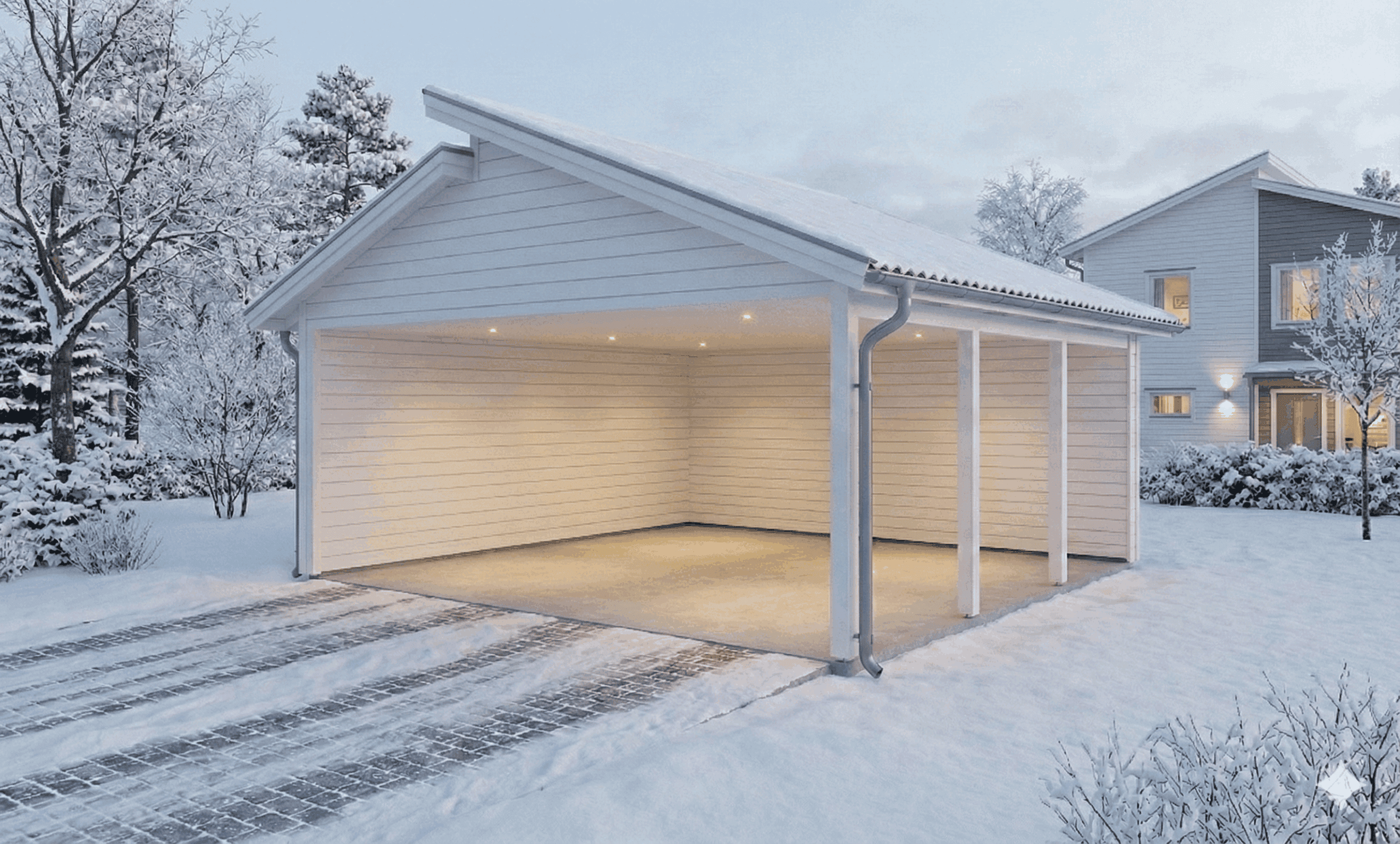 Dubbelcarport med plats för 2 bilar. Liggande panel och ryggställt pulpettak ger ett modernt intryck och passar till hus med samma stil.