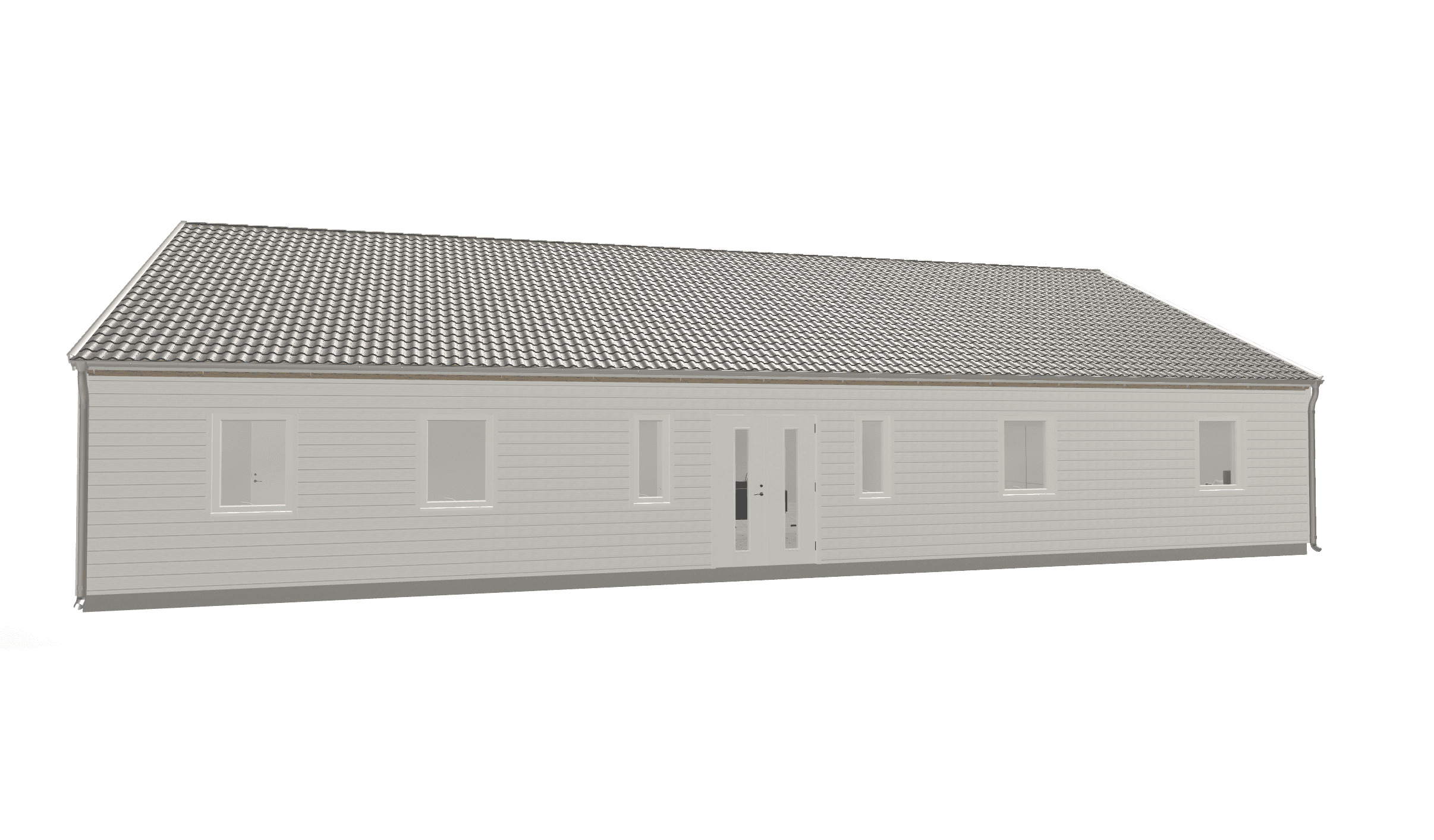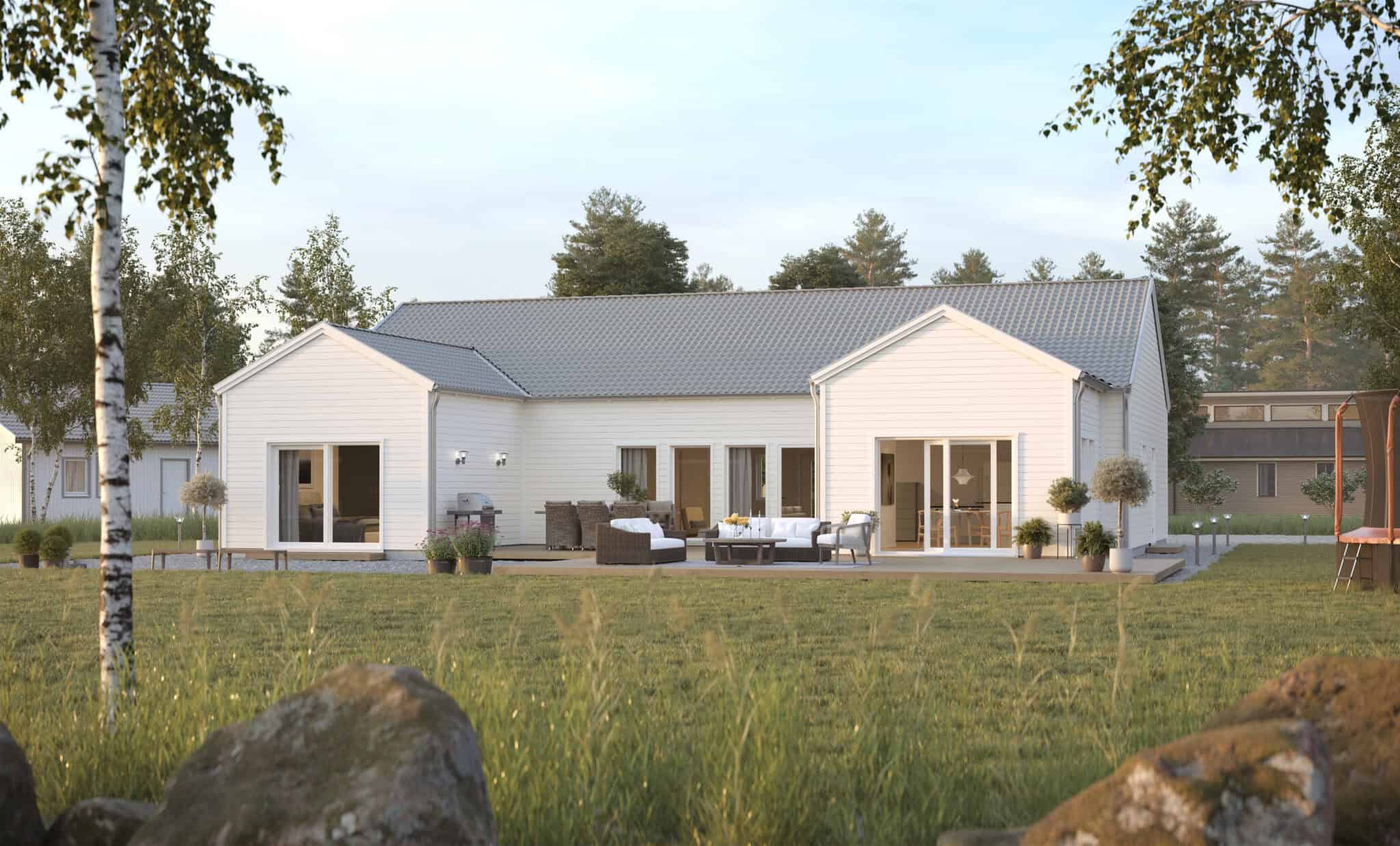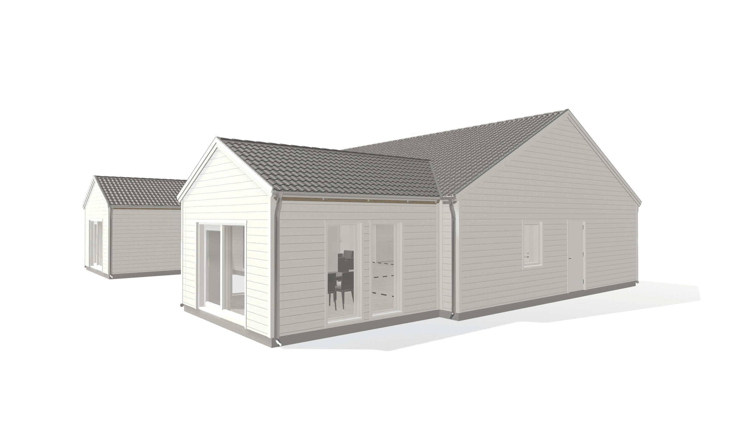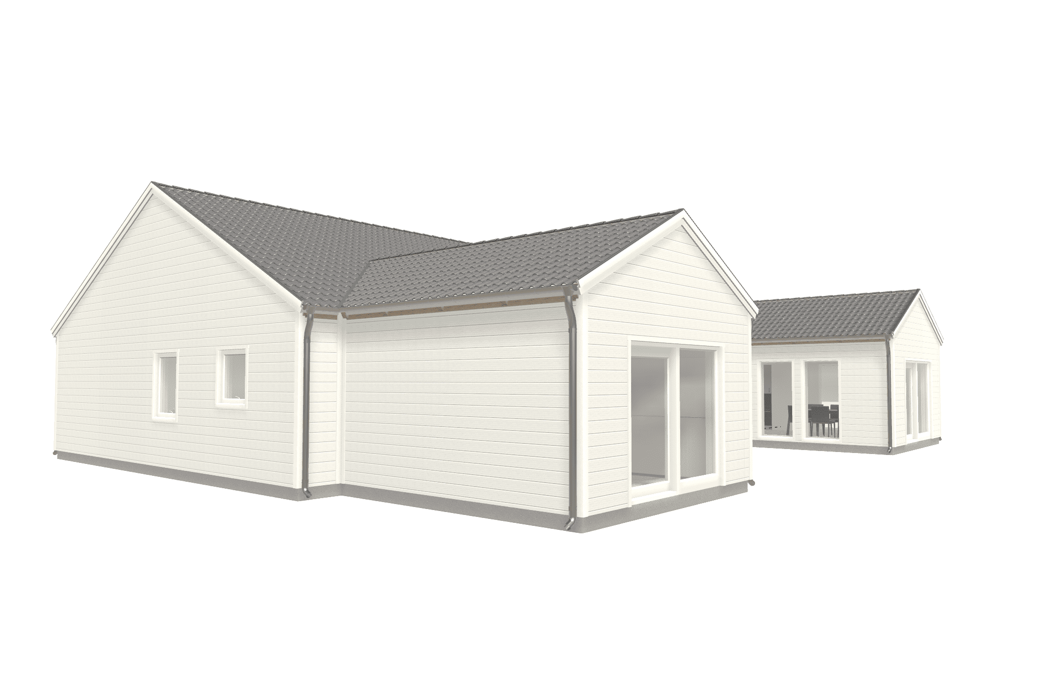 U-hus i ett plan med stora skjutfönsterpartier. Utan takfot och med liggande panel är detta ett modernt hus med en luftig och inspirerande planlösning. Stora öppna ytor där vardagsrum, kök och matplats är utformat för både högtider och vardag. Med fyra sovrum finns plats för familjen och om ni så vill kan ena sovrummet agera kombinerat hemmakontor och gästrum. En dröm för dig som har möjlighet att jobba hemma.