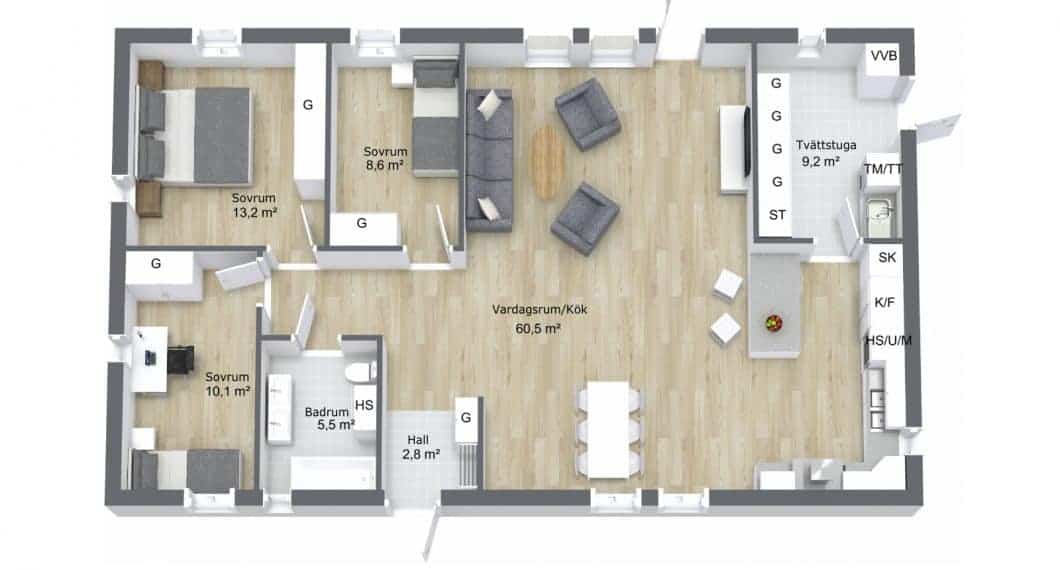 En 1-plansvilla på 113 kvm. Vi har placerat sovrummen i ena delen av huset för att ha familjen samlad och ge närhet till badrummet. Huset har en öppen planlösning där kök och vardagsrum skapar en funktionell enhet med stora sällskapsytor. Tvättstugan fungerar också som groventré.
