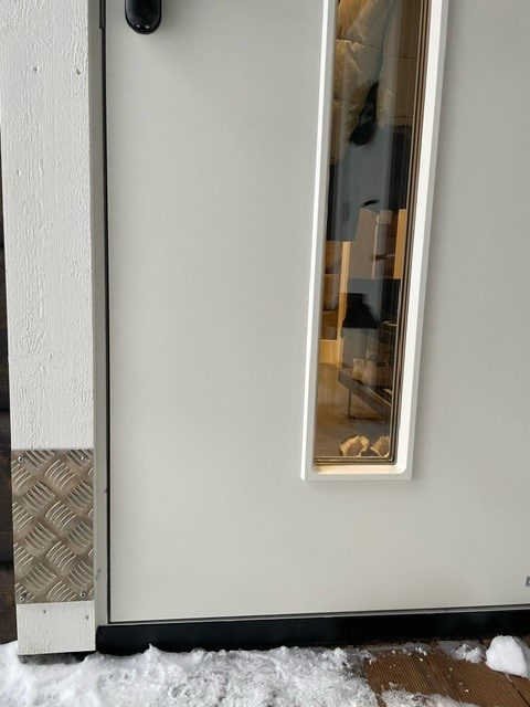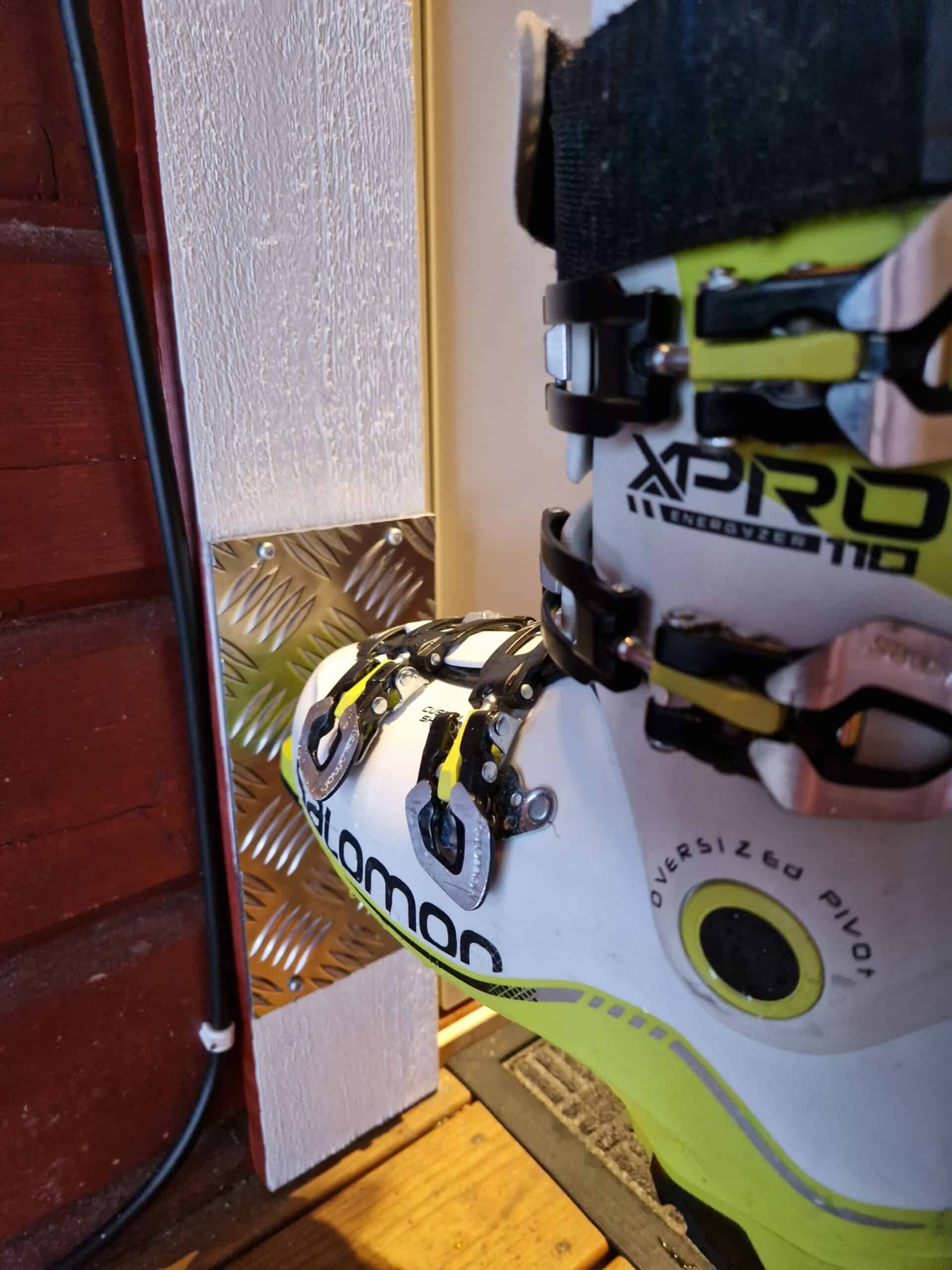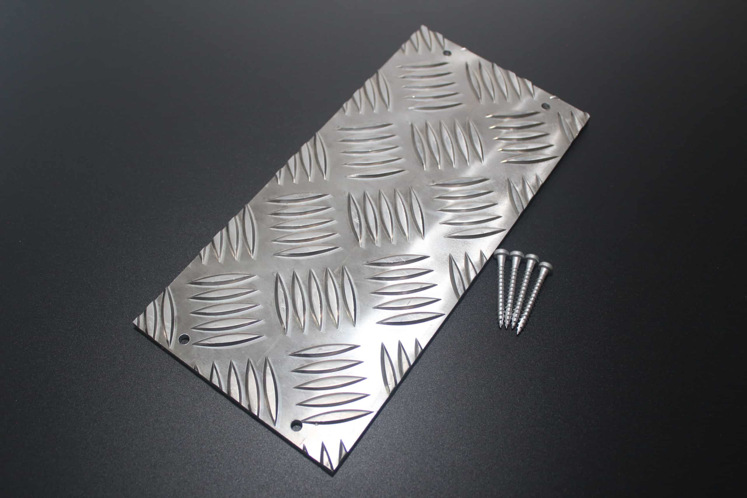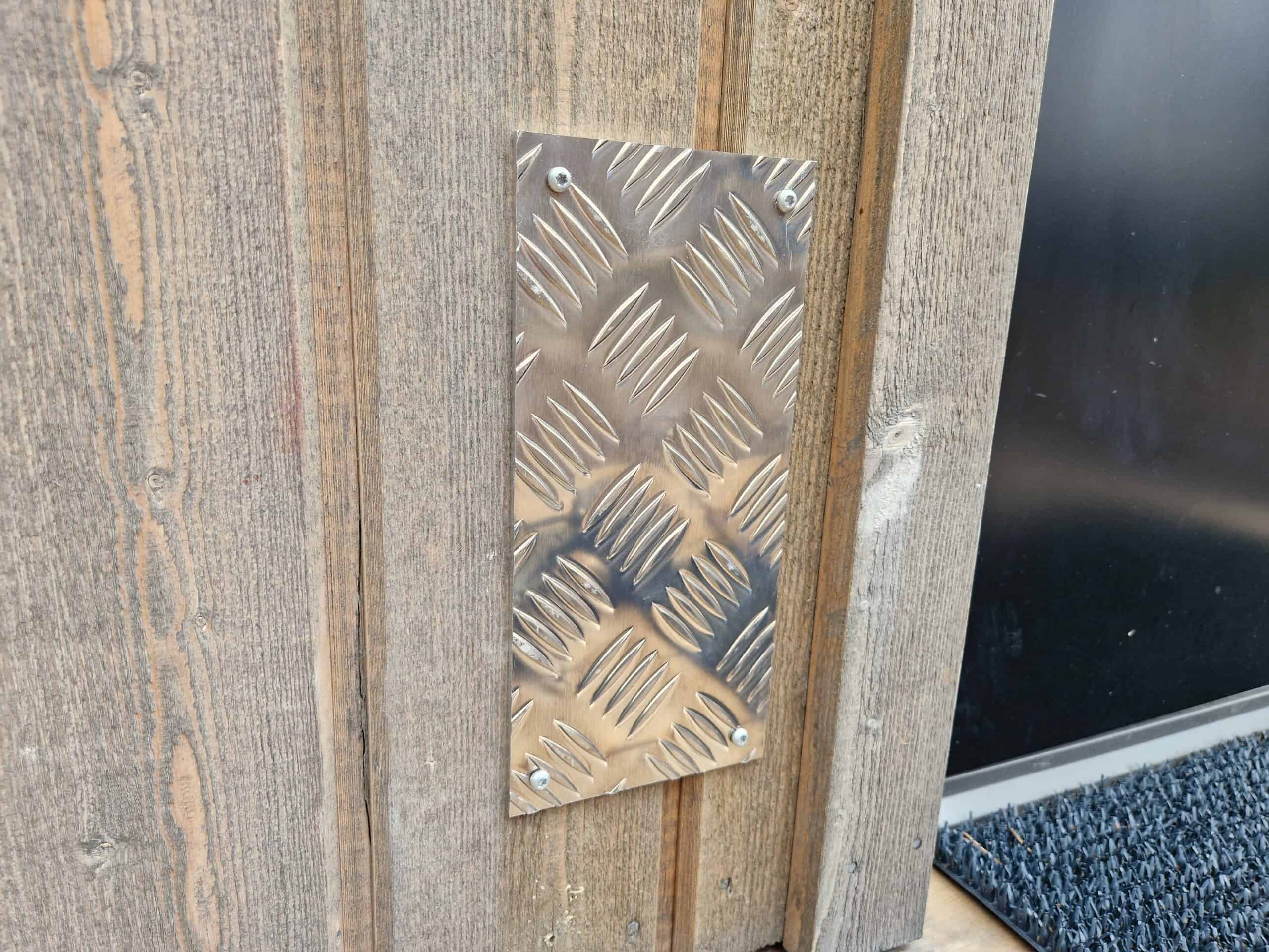 Sparkplåt i för pjäxor eller skor i kraftig aluminium. Plåten är förborrad och är därför mycket enkel att montera på dörrfodret eller bredvid.