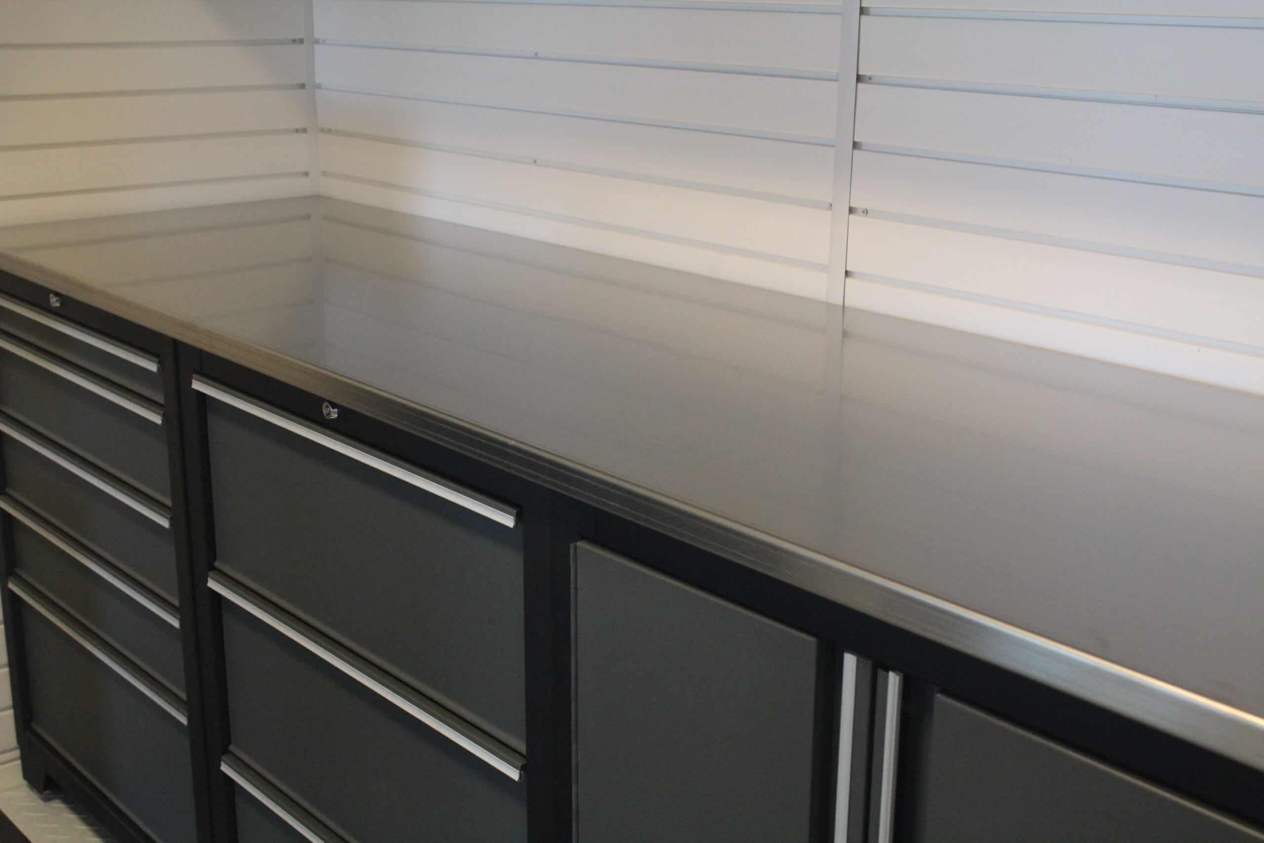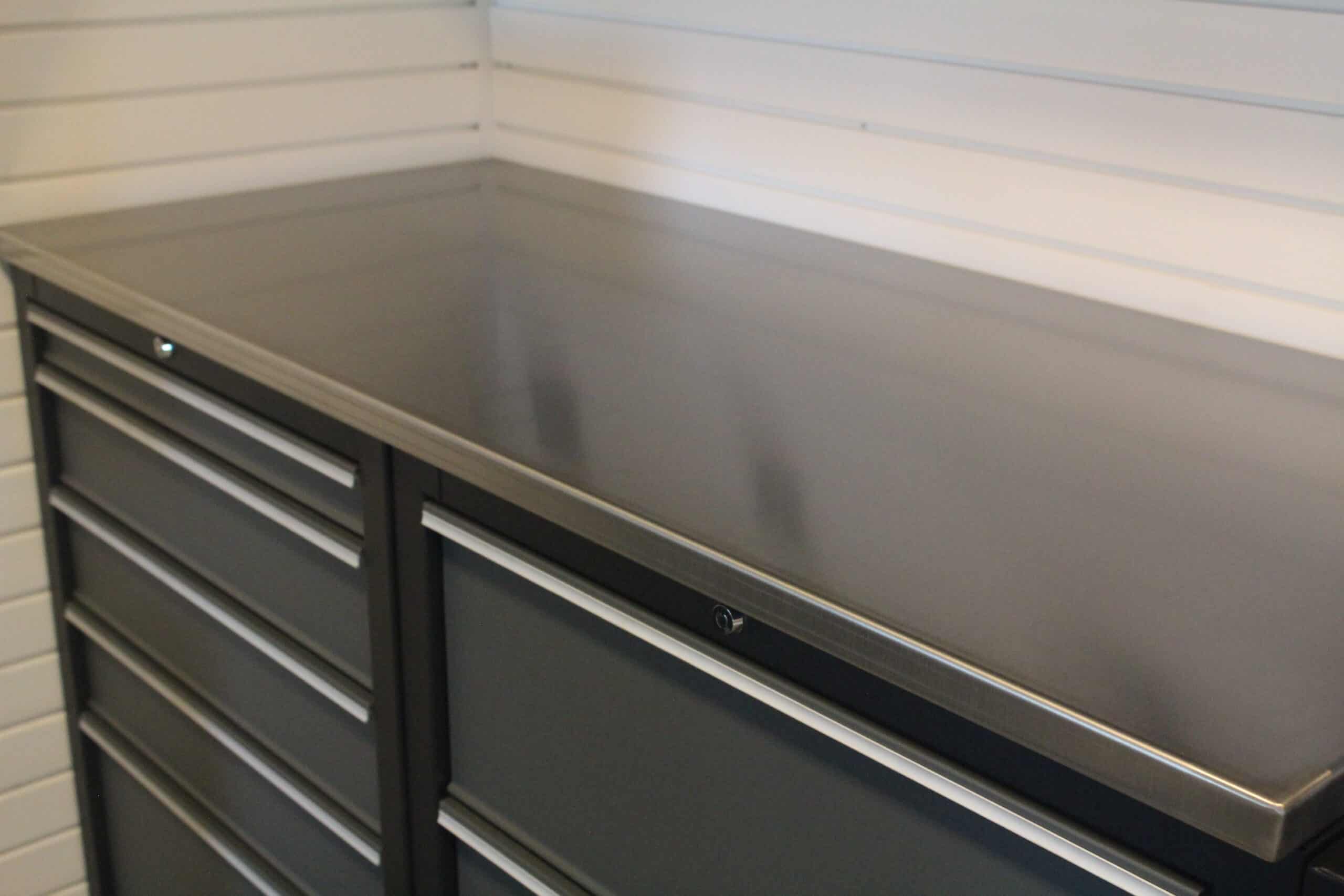 Bänkskivor till vår garageinredning är tillverkad i massiv MDF och klädd med 1,5mm borstad rostfritt stål. Passar perfekt till våra golvskåp pga sitt djup på hela 63cm. Finns i 2 olika längder, den långa täcker 3 golvskåp, den kortare täcker 2 golvskåp. Detta gör att hela garageinredningen känns mer gedigen och man får en ordentlig yta att jobba på.