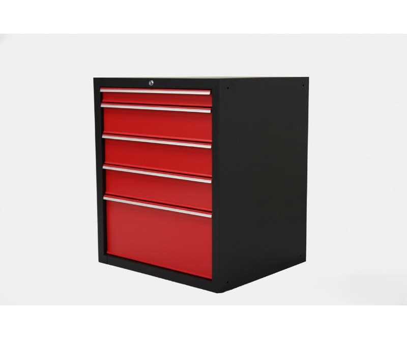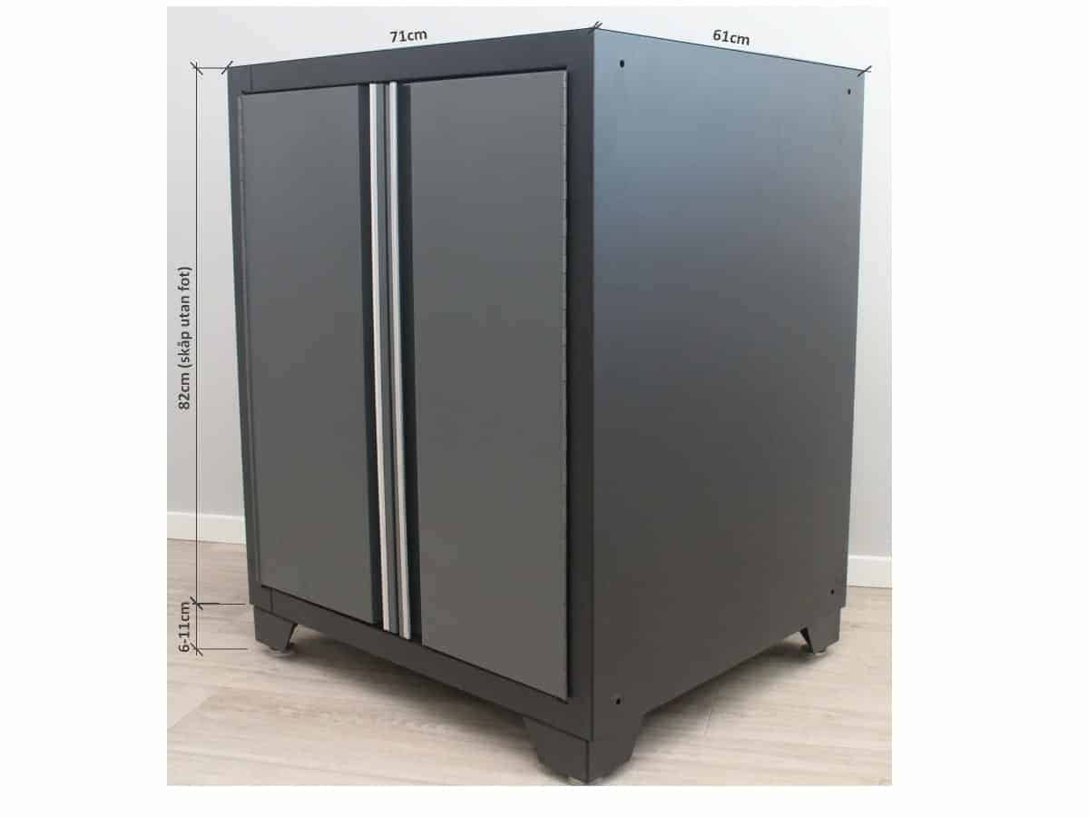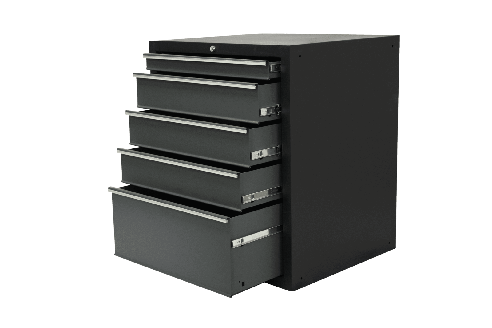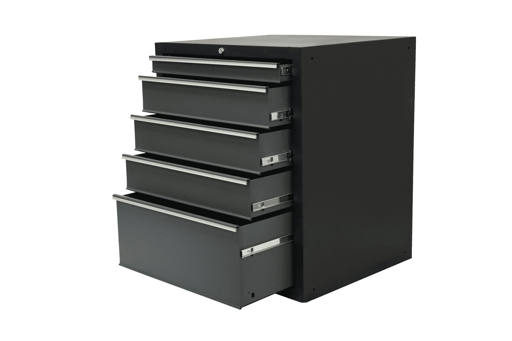 Vår garageinredning med 5 lådor är tillverkad i 100 % stål. De är helsvetsade i fabriken och kräver därför lite eller ingen installation. Endast foten behöver monteras så du är snabbt på plats med din garageinredning. Vår garageinredning kommer med en reptålig pulverlackfinish. Justerbara fötter för enkel nivåjustering om man till exempel har garagegolv med fall. Skåpet ger dig maximalt lagringsutrymme för exempelvis verktyg, bil-och trädgårdsprodukter, sportutrustning mm.