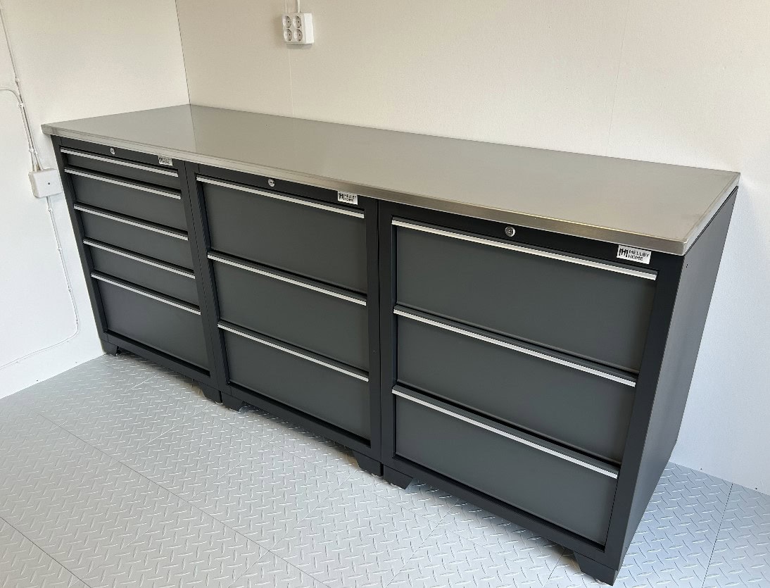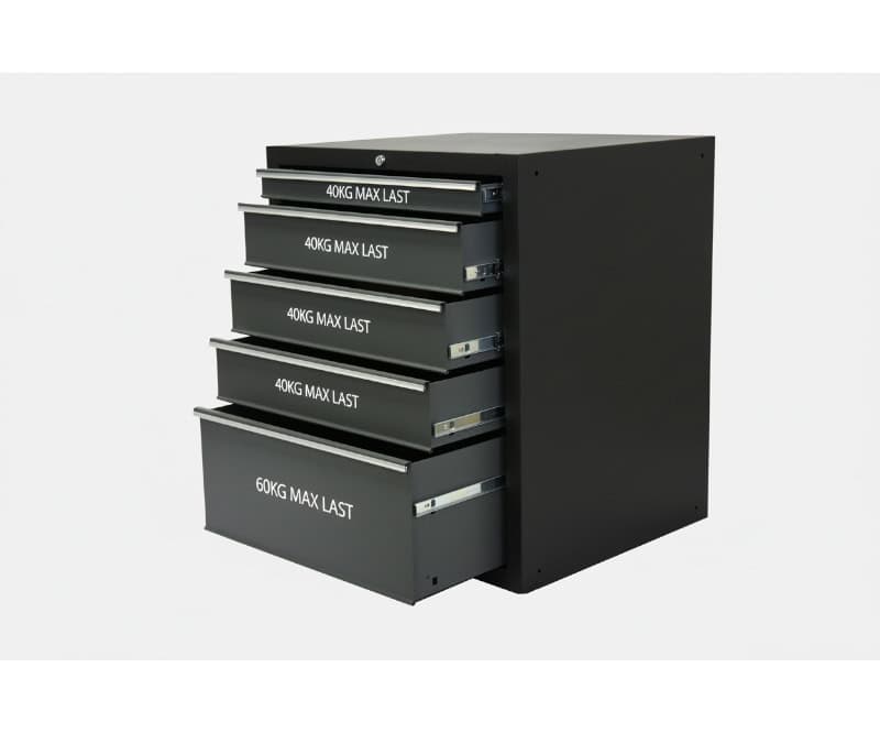 Denna garageinredning med 5 lådor är hela 61cm djupa så det finns mycket plats för verktyg i skåpen och ordentlig arbetsyta på skåpen. Lådorna har fullutdrag vilket innebär att det är enkelt att komma åt allt innehåll.