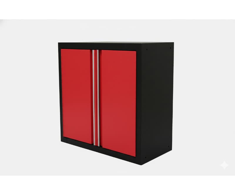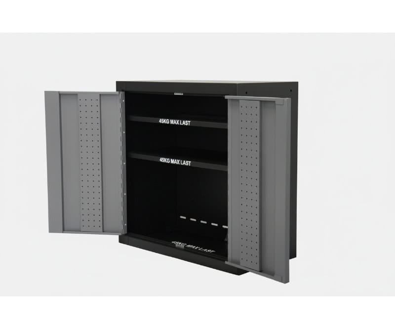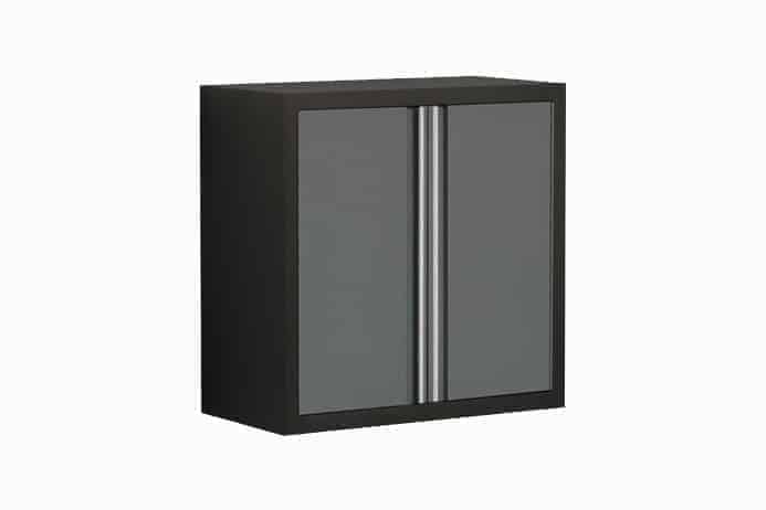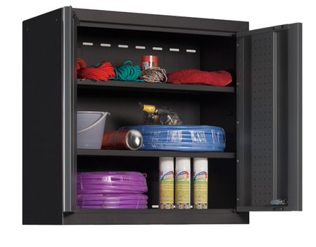 Väggskåp i pulverlackerad stål och flyttbara hyllplan som klarar laster upp till 45 kg. Väggskåpet är helsvetsade och levereras monterade och har dörrar med magnetiska dörrlås. Detta förvaringsskåp ger dig snygg förvaring för exempelvis verktyg, biltvätt och trädgårdsprodukter, sportutrustning mm. Dessa passar perfekt som garageinredning och kommer helt färdigmonterade.